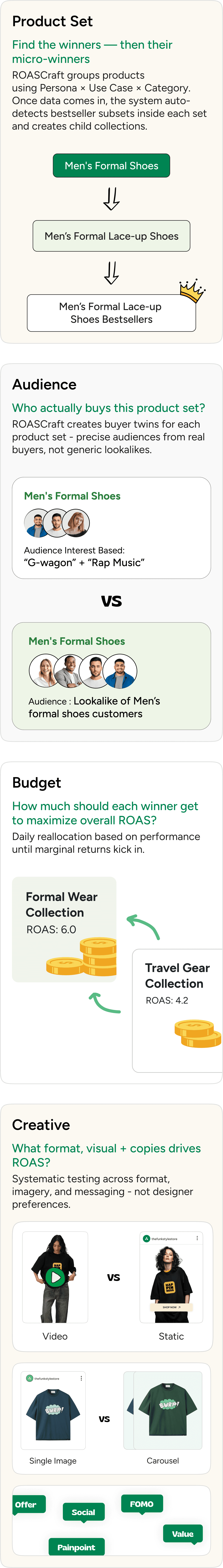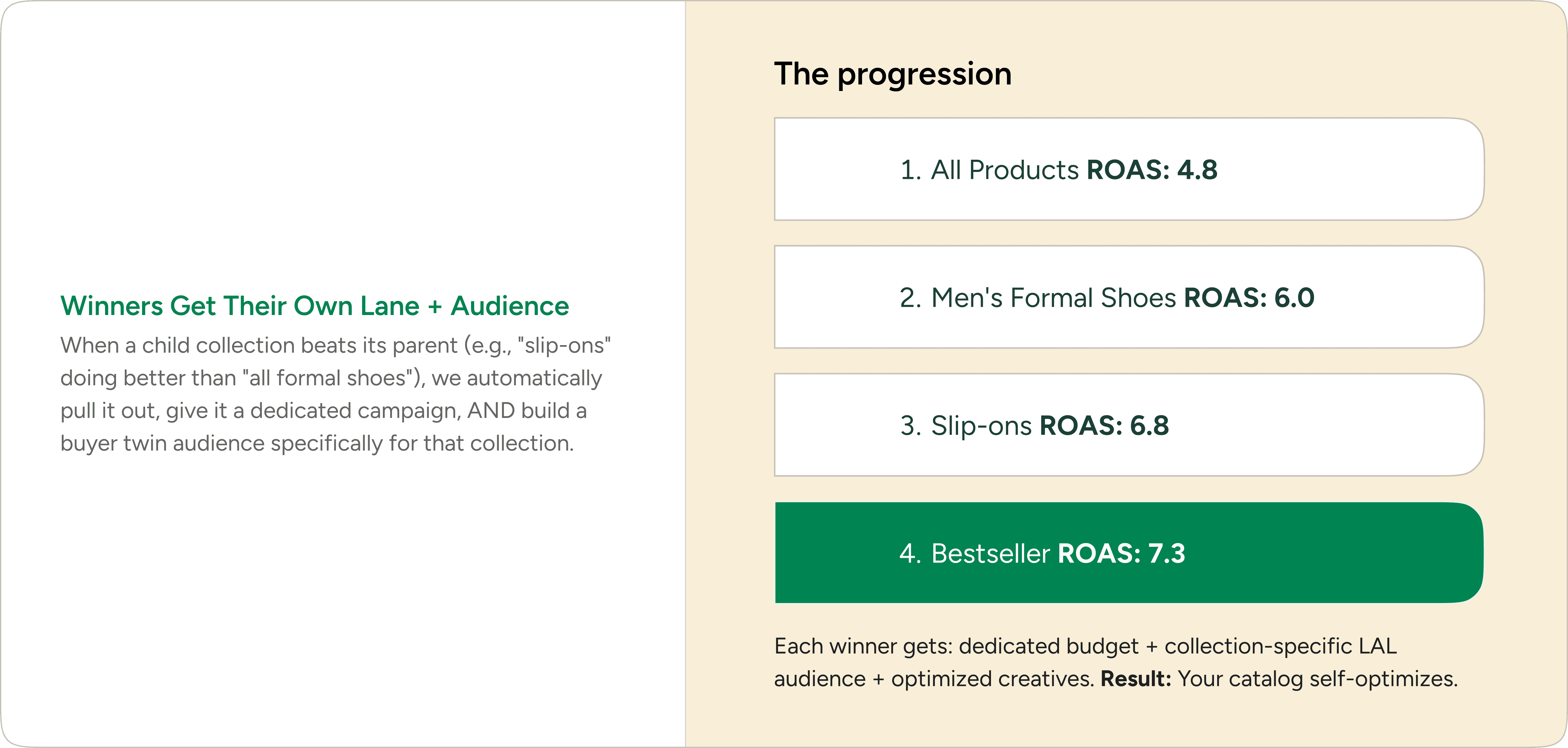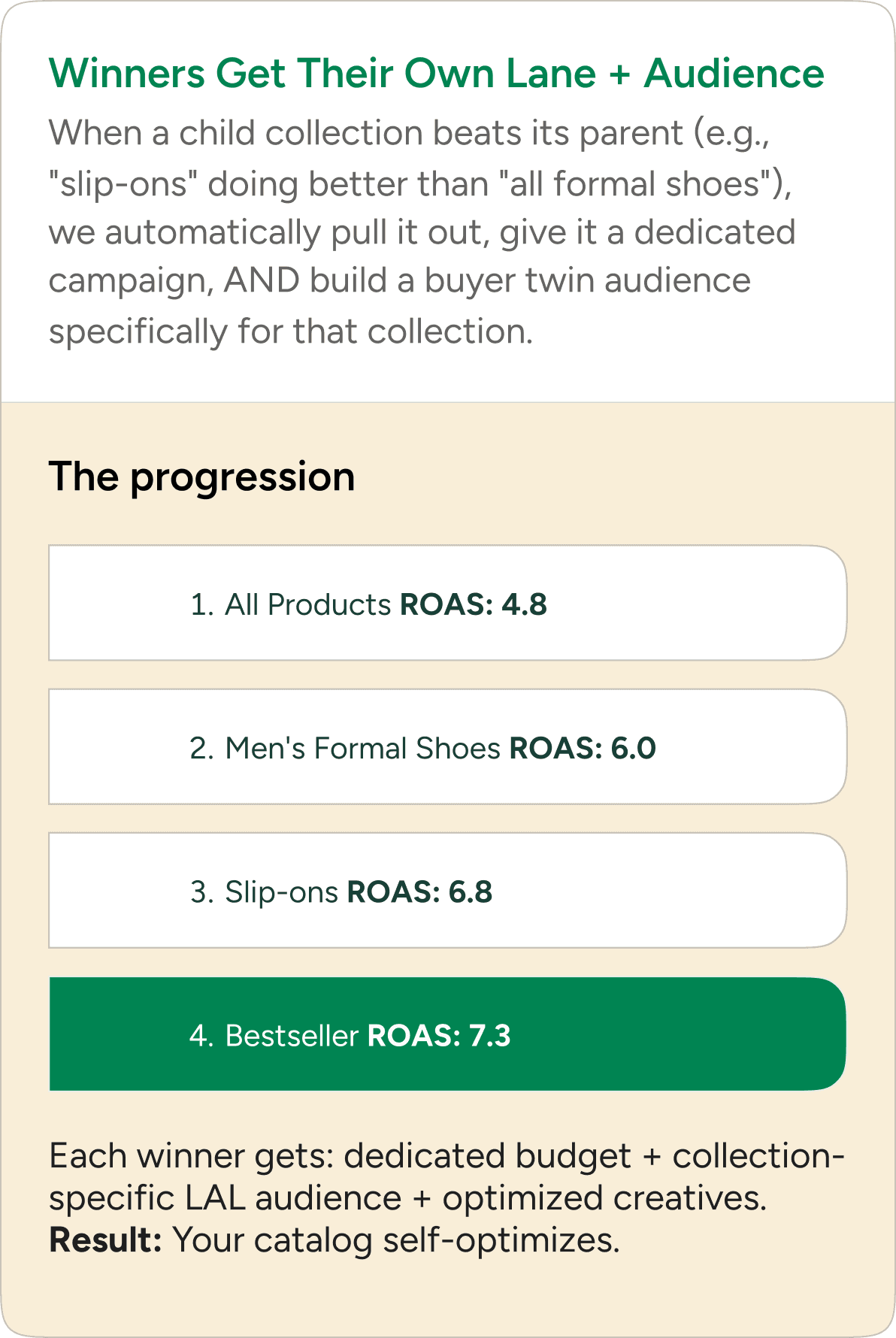Not just "better ROAS" - the mathematical maximum your catalog can achieve at your current scale.