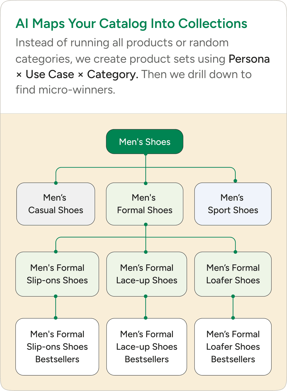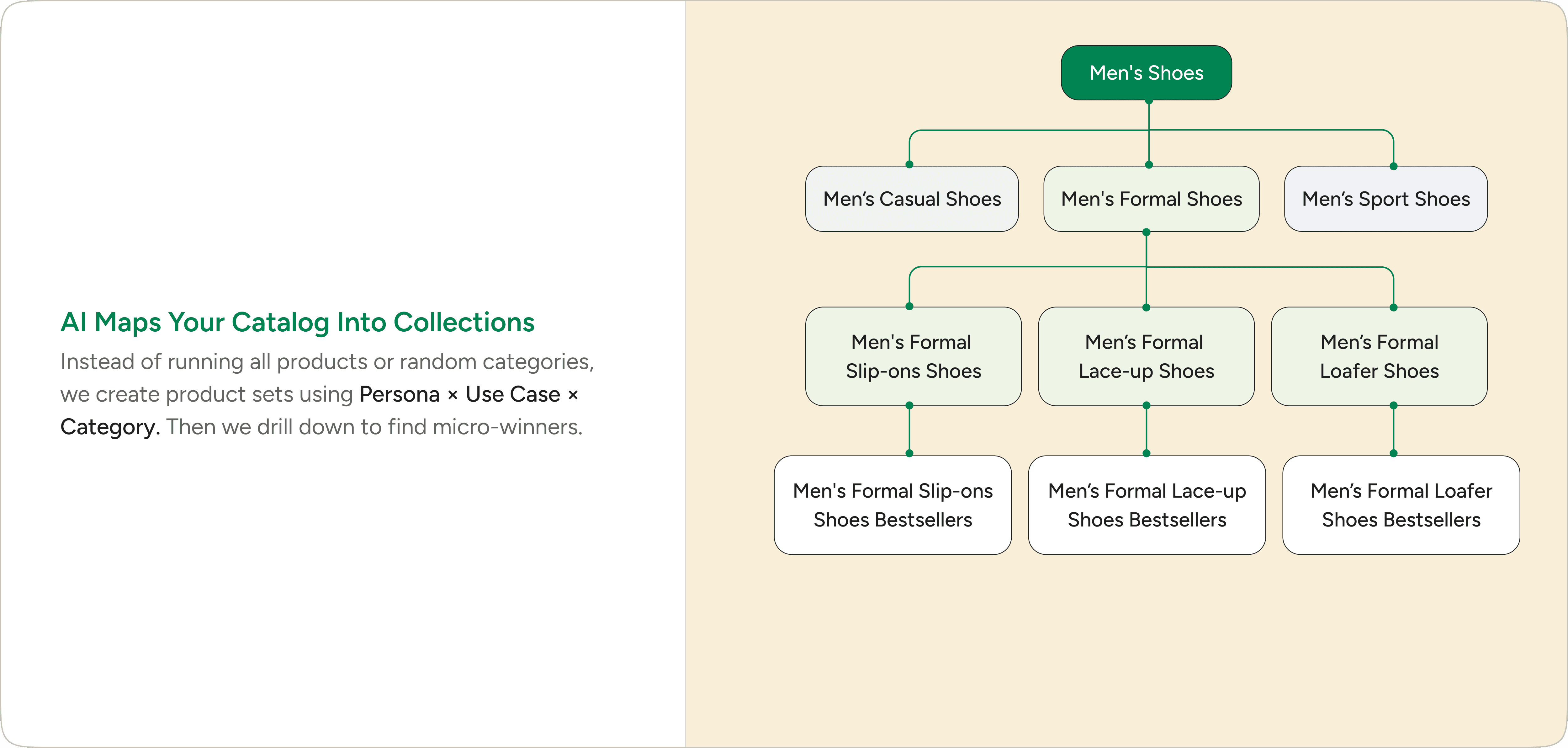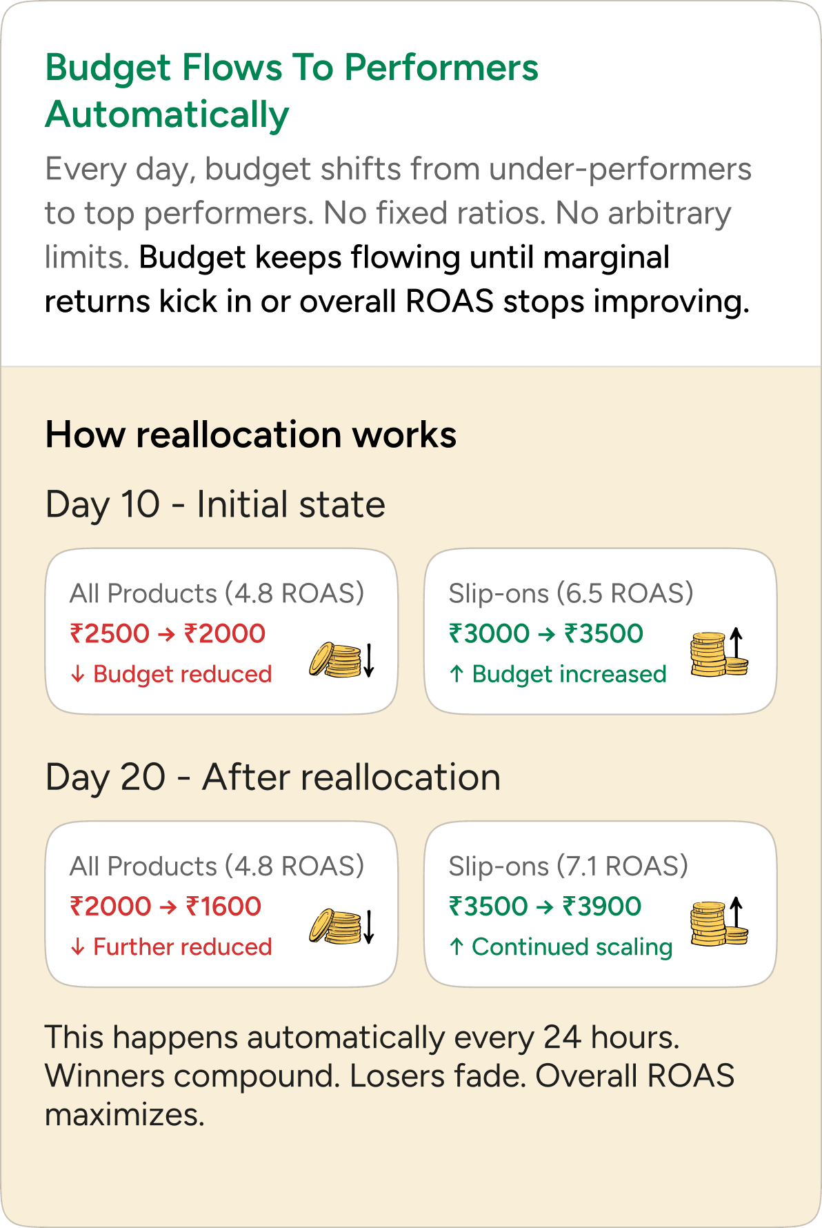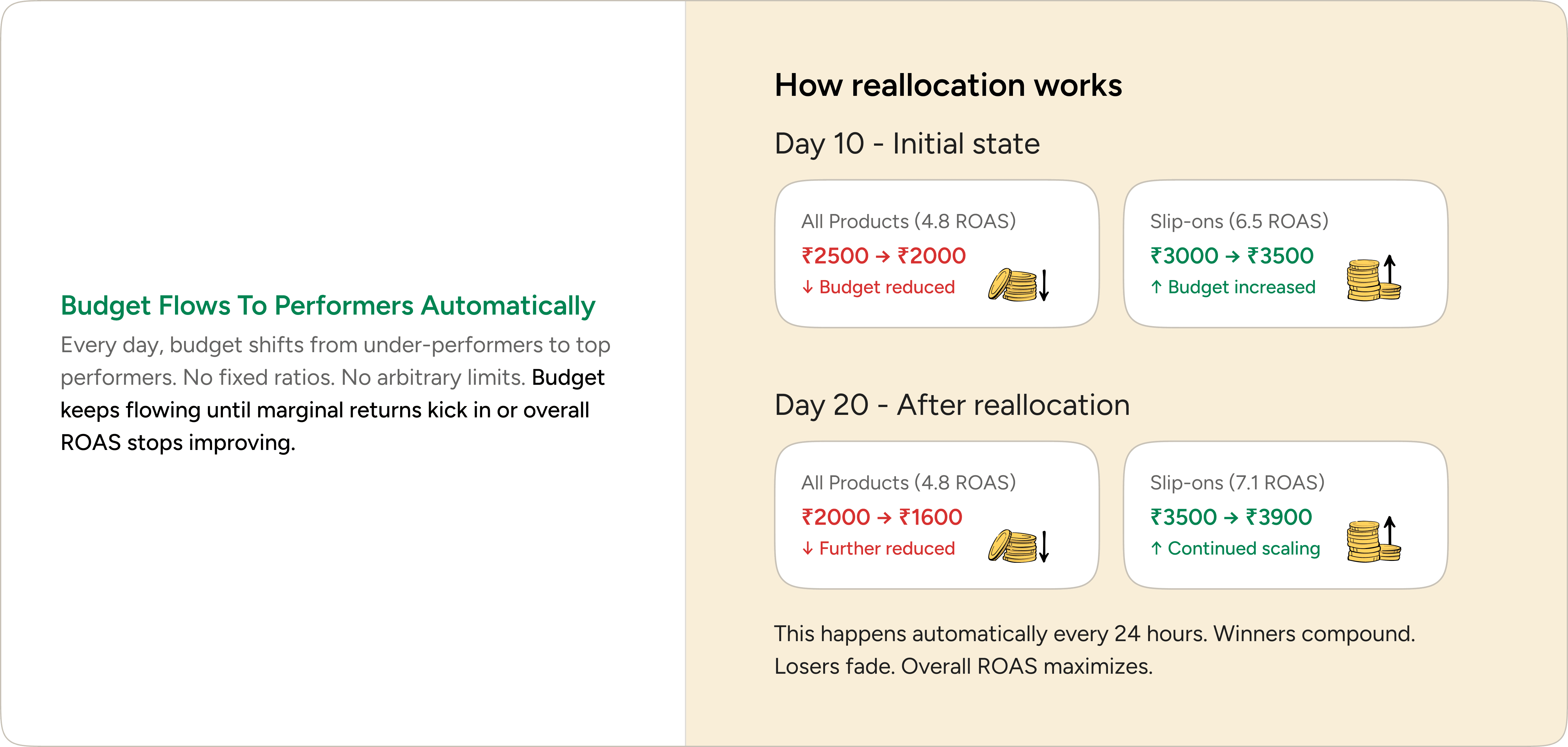 Not just "better ROAS" - the mathematical maximum your catalog can achieve at your current scale.