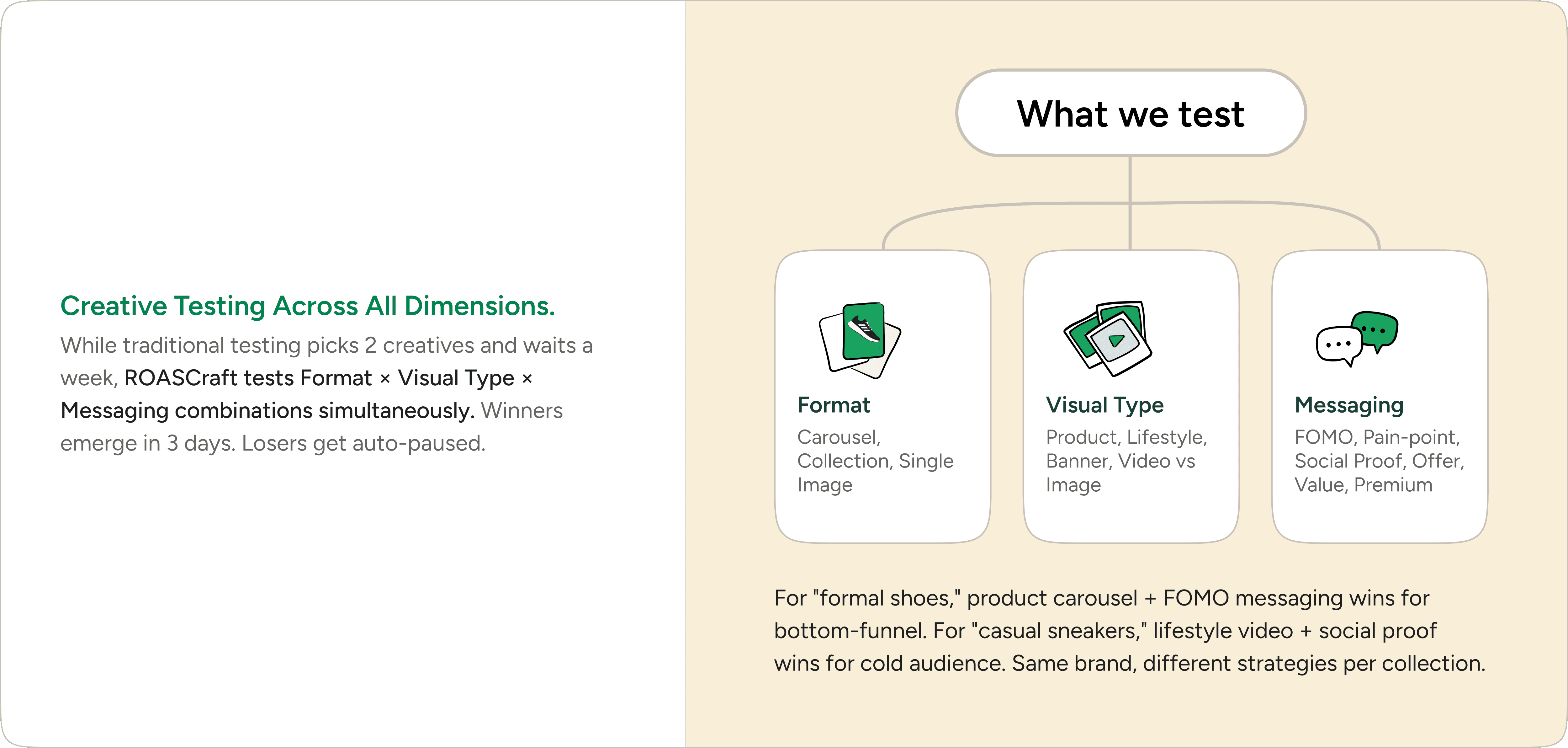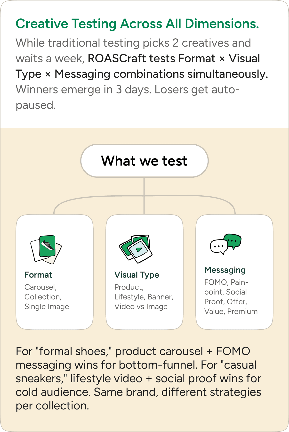 A premium fashion brand spent ₹2L on video production and ran video ads exclusively. Product static images were converting at 2.8x better ROAS for their bottom-funnel audience.